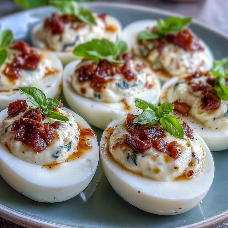 Save to Pinterest The other weekend, spring sunlight snuck across my kitchen table as I toyed with a platter of deviled eggs, promising myself I'd invent a new spin. The sound of my blender whirring basil oil made the whole kitchen bloom with sweet, peppery fragrance. Somehow, the humble egg borrowed the colors and spirit of a Caprese salad, and the results immediately felt like something worth repeating. There was mozzarella, juicy tomato, and emerald streaks of basil oil swirling atop creamy yolks. Every part of the process felt lively—inventive, but simple enough for a lazy afternoon.