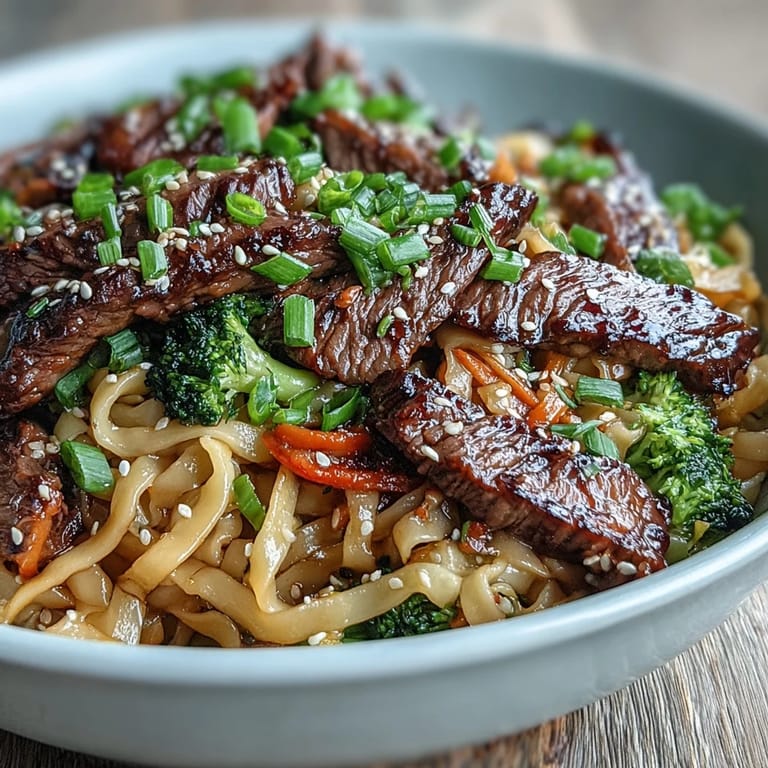 Save to Pinterest My neighbor knocked on my door one rainy Tuesday holding a takeout container half full of glossy noodles and beef. She said she'd ordered too much and thought I might want dinner. I reheated it in my skillet, and the smell of garlic and sesame filled my entire apartment. That single bite of tender steak tangled with slippery rice noodles made me want to recreate it immediately. I started testing versions the very next weekend, tweaking the balance of soy and brown sugar until the sauce clung to every strand just right.