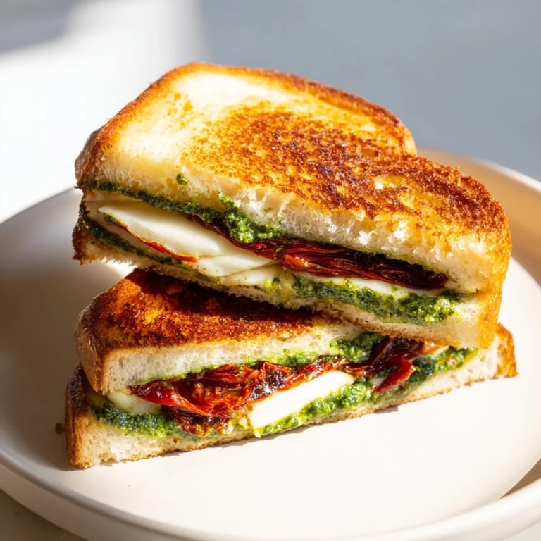Save to Pinterest There's something about the smell of butter hitting a hot skillet that makes me pause whatever I'm doing. One Tuesday afternoon, I stood in my kitchen with leftover pesto and the prettiest ball of fresh mozzarella, and I thought: why not make grilled cheese feel like something I'd order at a nice restaurant? The first bite was a revelation—crispy edges, melted cheese, bright basil, and those sweet sun-dried tomatoes all coming together. It became my answer to "what's for lunch" on days when I needed something special but didn't have much time.