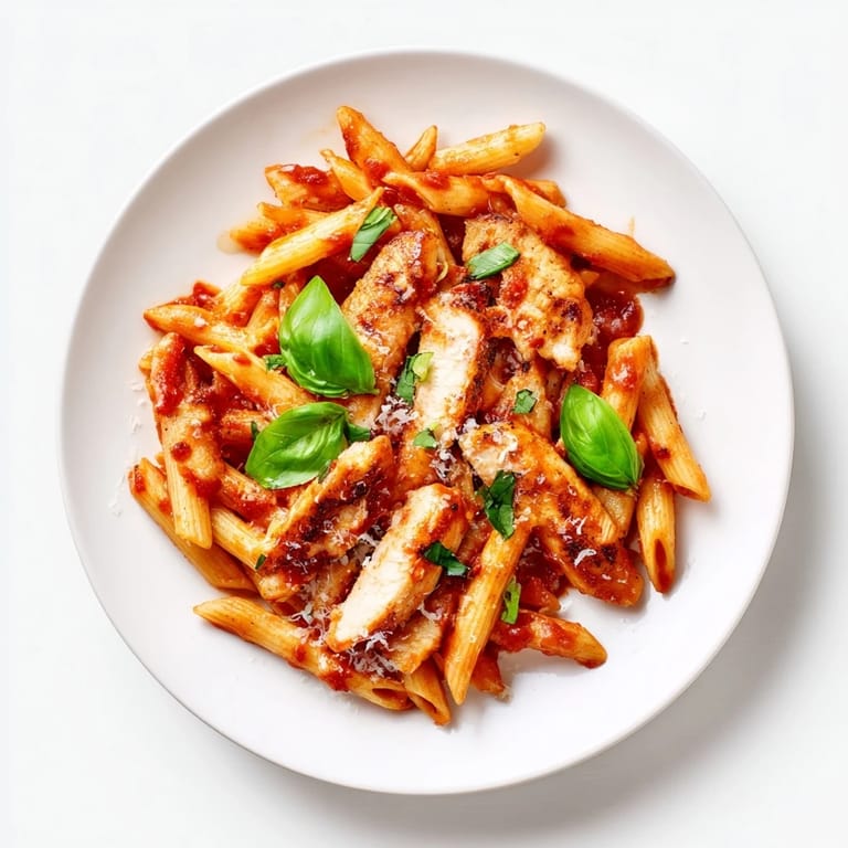 - Add the cooked penne directly into the sauce and toss until every piece is glossy and coated. Top with the sliced chicken, then scatter fresh basil and Parmesan over the top before serving hot.
