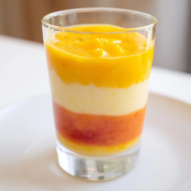 - Blend orange juice with the remaining yogurt and honey until silky. Pour this the same way—slowly, over a spoon—so it floats on top without disturbing the layers below.